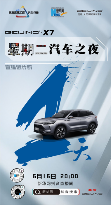 欢迎广大网友锁定2020年6月16日晚20点,在新华网抖音直播间,一起“尝鲜”超级汽车秀,BEIJING-X7一年使用权大奖等你来拿。