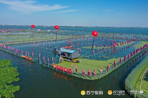 (苏宁易购快消集团副总裁卞农捕捞起阳澄湖第一篓蟹)